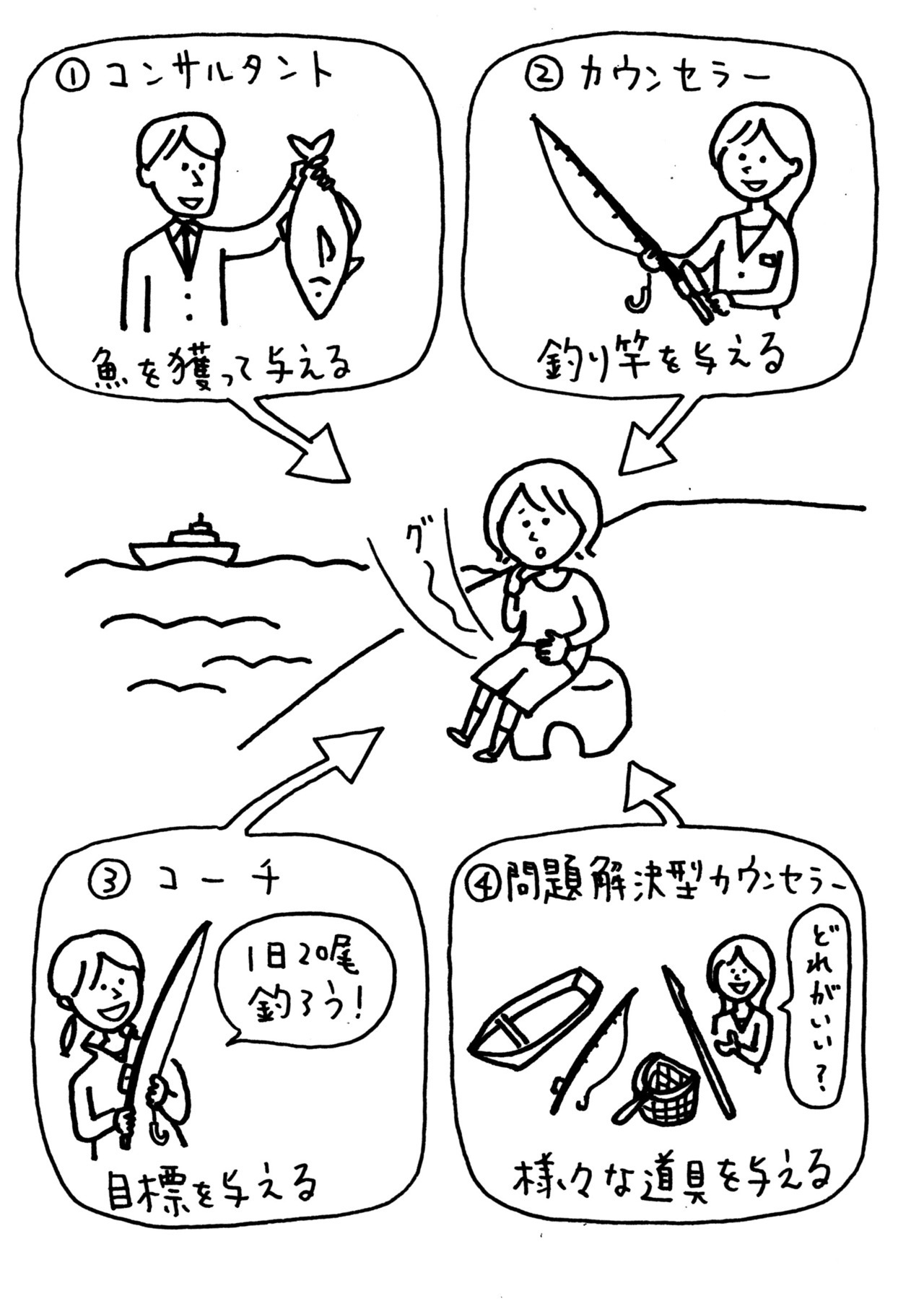 海を目の前におなかを空かせた子どもに対して、釣り竿だけでなく、船や網、銛、罠など、さまざまな釣りの道具を与えるのが、問題解決型カウンセラーなのです。